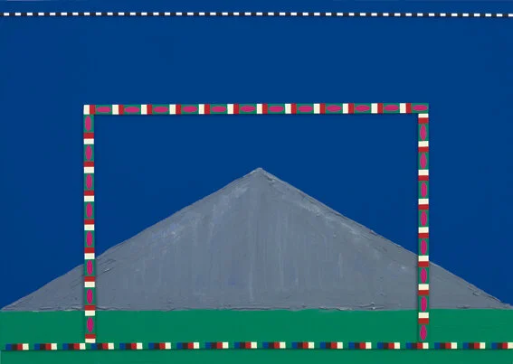 The same year, Regina Bogat was invited by the Museum of Contemporary Art of San Diego while a new exhibition held at the Zürcher Gallery of New York revealed a series of paintings from 1980 : The Phoenix and the Mountain. The artist found the inspiration for these pieces after the discovery of the famous geoglyphs or “Nazca lines” during a trip with her husband in Peru, in 1977. At this time, Regina Bogat and Alfred Jensen were absorbed by the study of the Tao philosophy and the first Tibetan Buddhist, which deepened their interest for the sacred mountains of China and its pilgrimages. The Phoenix and the Mountain series is a metaphor of a perpetual movement recalling some of her works from the 1960’s. The viewpoint on the mountain represented in the background is framed by a square of wood sticks mounted on the canvas. It shows the distance to be travelled, the journey to make. The more we progress in the series, the more the window widens until the point of completely disappearing.